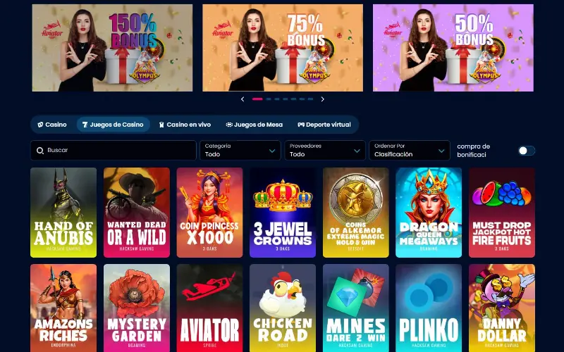 La página de inicio muestra inmediatamente las promociones, los bonos y lo que los jugadores pueden esperar del casino. La página principal de juegos muestra los títulos más populares, las ganancias en vivo, los principales proveedores y una lista clara de todos los juegos disponibles.